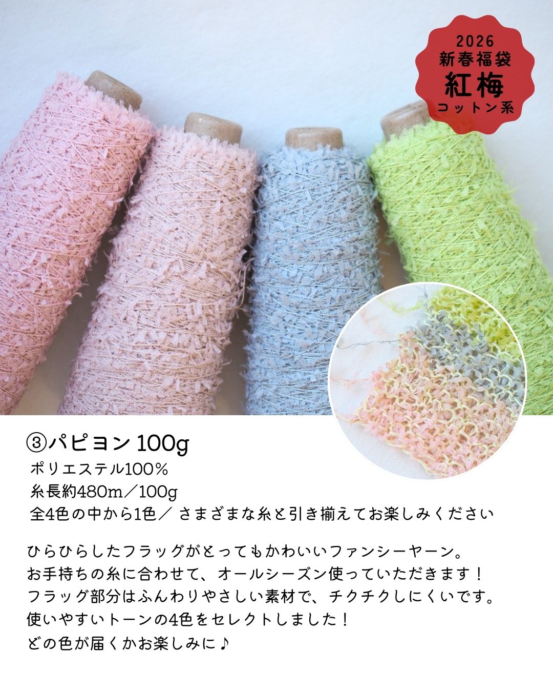 いろんな糸が100gずつ入りますので、小物作りにピッタリです♪