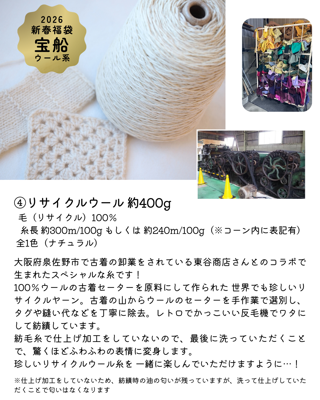- リサイクルウール原料の特性上、繊維長が短く切れやすくなっています。結び目が混入することがございます。